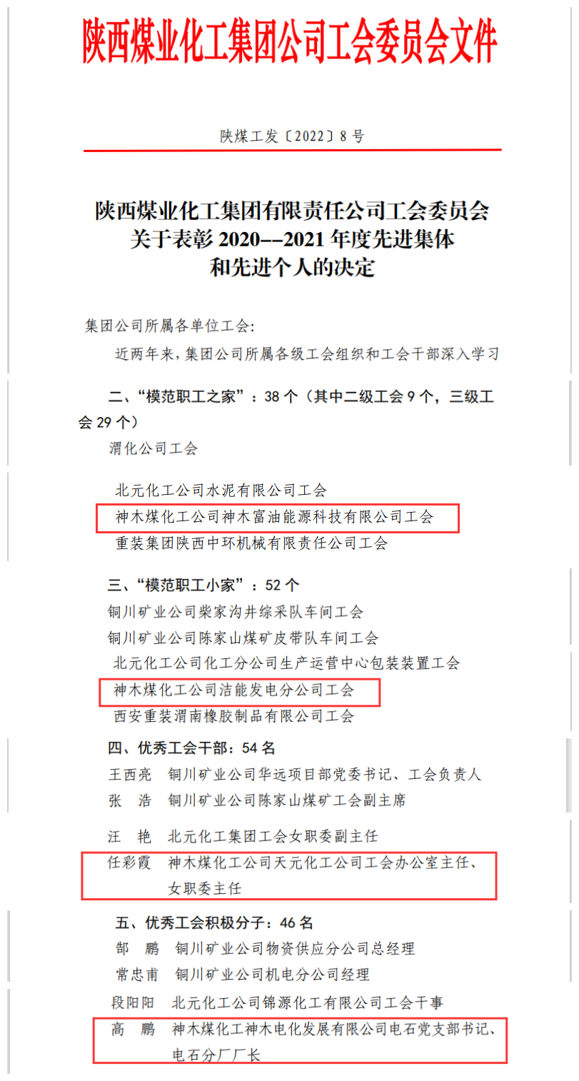 近日,陜煤集團(tuán)公司工會(huì)表彰了2020年—2021年度先進(jìn)集體和先進(jìn)個(gè)人,神木煤化工公司工會(huì)獲得了多項(xiàng)榮譽(yù),所屬富油公司工會(huì)、能源公司潔能發(fā)電分公司分別榮獲“模范職工之家”“模范職工小家”稱號(hào);所屬天元公司任彩霞、電化公司高鵬分別獲得“優(yōu)秀工會(huì)干部”“優(yōu)秀工會(huì)積極分子”榮譽(yù)稱號(hào)。