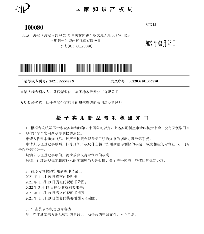 近日,神木煤化工天元公司申請的“適于含粉塵和焦油的煤氣燃燒的長明燈及熱風(fēng)爐”實(shí)用新型專利獲得國家知識(shí)產(chǎn)權(quán)局授權(quán)。