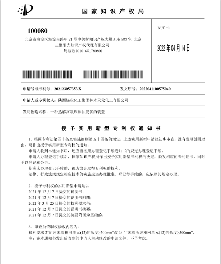 近日,神木煤化工天元公司申請(qǐng)的“一種熱解高氯煤焦油脫氯的裝置”和“一種旋風(fēng)分離器”獲得國(guó)家知識(shí)產(chǎn)權(quán)局授權(quán)。