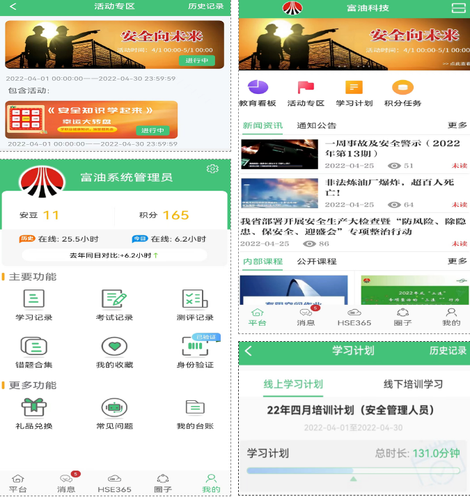 截至目前,富油公司線上安全學習網絡空間根據內容規劃建設,有節奏的矩陣化部署了六大類,148個課程,近500個課件,2000多道試題;全員100%普及化參加學習,平均每人每天學習4.1次,累計培訓員工1.83萬人次和學時1.37萬小時。建立了培訓學時學分累積制度,推行以“員工”為中心,“績效考核+活動激勵”相結合的執行方式,“每日一練、每周一課、每月一考”等多種學習形式參與,并在其過程中組織開展內訓師培訓,推動公司安全管理人員、技術人員走進培訓空間,形成了“富油有空間、人人用空間”的良好氛圍,為富油安全教育普及化發展注入了強勁動力。